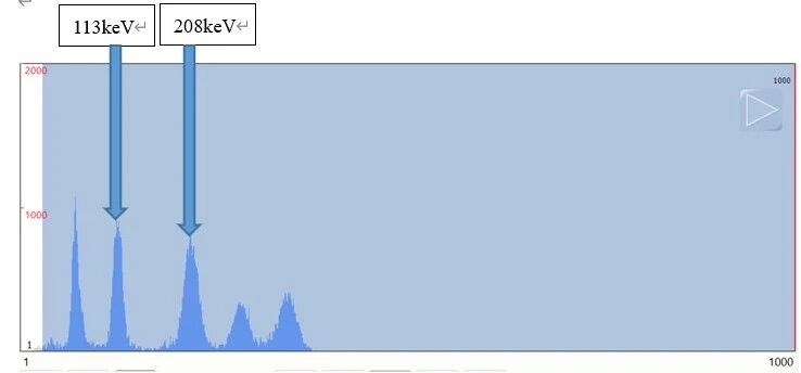 177Lu的基本性质:半衰期6.7天,主要的β射线能量0.497 MeV,射程约1.7毫米,衰变过程中会释放γ射线,其中113 keV(6.4%)和208 keV(11.0%)是射线概率最高的两条分支,使用Wizard 2480 γ计数器对177Lu进行检测,能谱图见图1。