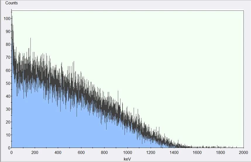 在使用4910TR液闪闪烁计数器和闪烁液对90Y的生物样品进行检测时,高能β射线与高效闪烁液(如ULTIMA GOLD)相互作用,加上液体闪烁计数器的高性能硬件PMT识别,其检测计数CPM值与放射性活度DPM值基本一致,且样品在一定的tSIE(transform Spectral Index External Standard外标准转换普指数法,4910TR液闪闪烁计数器用于评估淬灭程度的一个指标)值内,CPM计数不受淬灭的影响,能够维持100%的检测效率,准确的检测出样品的放射性,属于较为准确的针对90Y放射性核素的样品分析方法。其劣势在于LSC检测时,需要将样品先制备成均值的溶液,才能与闪烁液混合后进行检测分析,样品制备过程相比用γ计数器检测会较为复杂,同时还需要考虑部分样品如全血因颜色问题导致的过度淬灭的情况。液体闪烁计数器(4910TR)检测90Y的能谱图见图4,能谱范围选择0~2000 keV。
