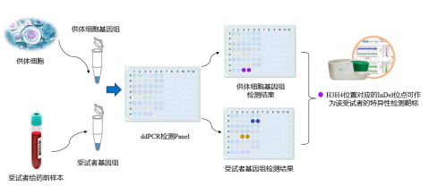 在未经基因修饰/改造的同种异体细胞治疗产品的细胞动力学分析中,使用该dPCR检测panel筛选出该受试者的特异性引物探针对:通过对比供体细胞(细胞治疗产品)与受试者的基因组,选择出在供体细胞(细胞治疗产品)中存在,而在受试者中缺失或插入的InDel位点(纯合插入或纯合缺失),该位点即可作为该受试者的特异性检测靶标,用于细胞动力学分析。